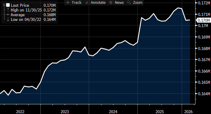 - There remains uncertainty about where the new equilibrium level of job creation is following a slowdown in immigration and upturn in deportations which has shrunk the labor force over the past year by just over 1 million workers (see graph below). It used to be thought that job growth of 150 thousand per month was necessary to maintain a stable unemployment rate when immigration levels, and a growing labor force, were higher. Thus, a lower equilibrium level is expected, but at what level exactly?