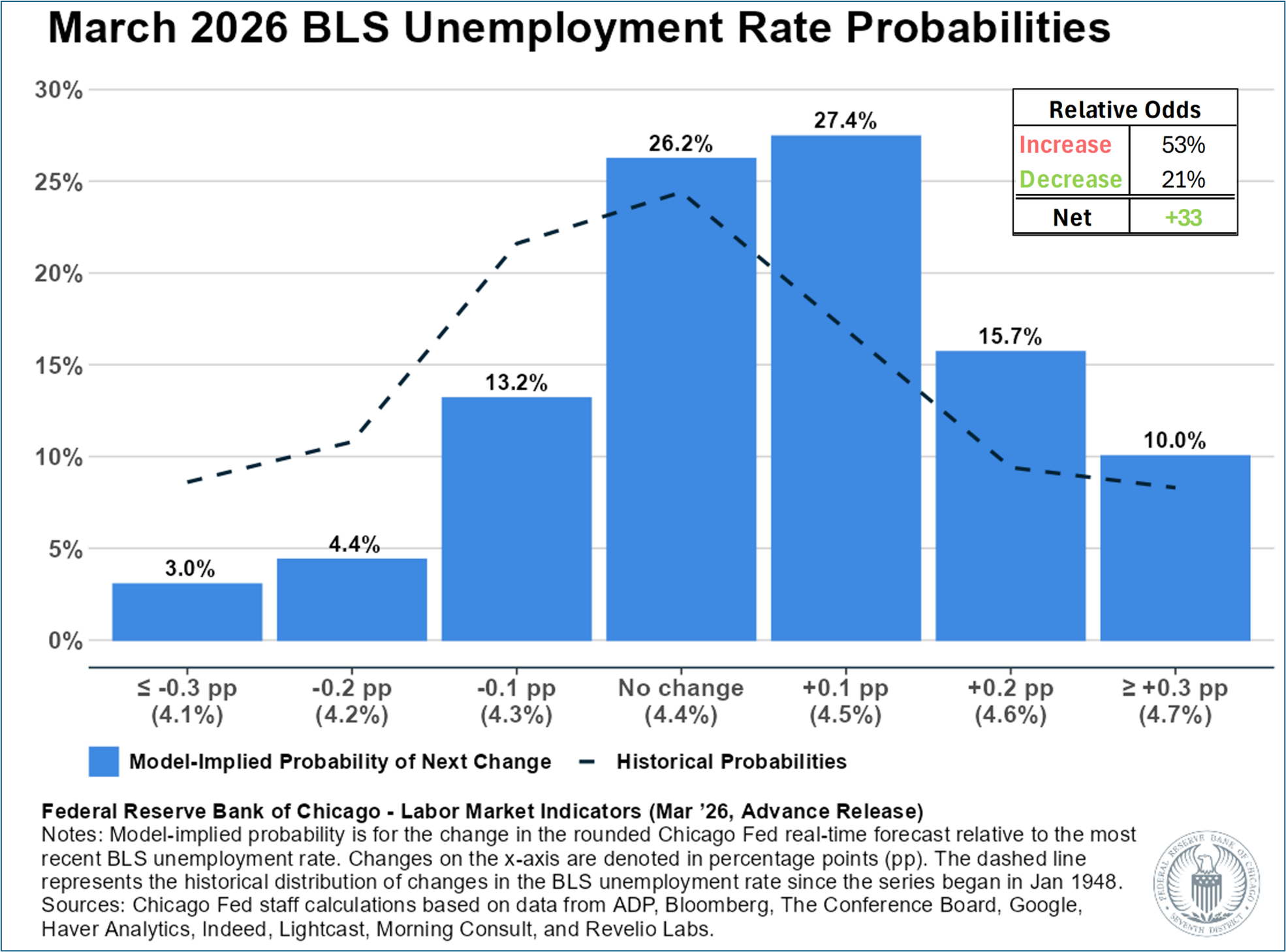 - The Chicago Fed Real-Time Unemployment Rate Forecast for March is 4.46%, up slightly from the BLS 4.4% rate for February. The Chicago Fed Real-Time Unemployment Rate Forecast is a median estimate of the unrounded BLS unemployment rate from a statistical model. The BLS reports the official unemployment rate rounded to the nearest tenth, although many analysts dig into the details for the unrounded figure. The current forecast implies 21% odds of a decrease, 26% odds of no change, and 53% odds of an increase, (see graph below).
