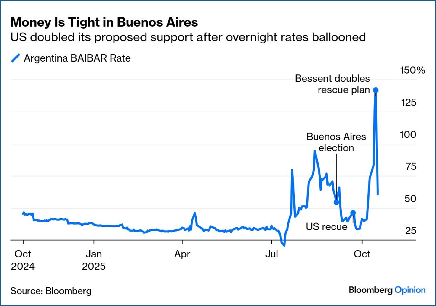 - One of the side stories that intrigues us is the US assistance to Argentina as President Milei struggles to maintain control over his economic program to cut spending and restore some stability to prices and the peso. The US has agreed to supply a $20 billion swap line, which was quickly doubled to $40 billion, giving Argentina funds to fight currency flight and depreciation which threatens higher inflation and damage to Milei as parliamentary elections approach this weekend. The controversial US aid to a foreign country, over pleas for assistance from US soybean farmers and cattle ranchers struggling under Trump’s tariff regime, has so far failed to stabilize the peso or assist Milei in his party’s prospects for the upcoming election. Trump has said he would desist with US assistance if Milei’s party, La Libertad Avanza, fares poorly in the Sunday elections so the risks are large.