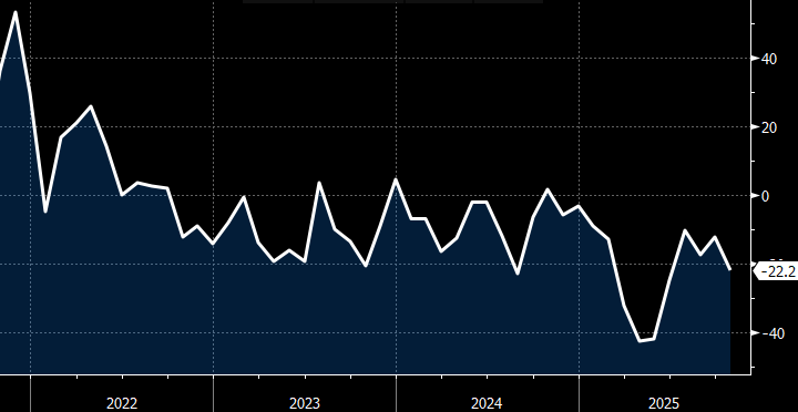- As the government shutdown and data blackout continues our search for alternative data points continues and one of those sources are the regional Fed activity surveys. As the Fed is independently funded it’s not subject to the government budgetary blockade so they continue to issue data that may be limited in scope but still provides some clues while we scud run below the low cloud base squinting for an opening. In that regard, the latest from the Philly Fed’s October Non-Manufacturing Activity Survey wasn’t that great. By way of background, the monthly survey tracks insights from business owners, executives, and managers in the Third Fed District, which comprises central and eastern Pennsylvania, southern New Jersey, and Delaware. Survey responses were collected from Oct. 6-16.