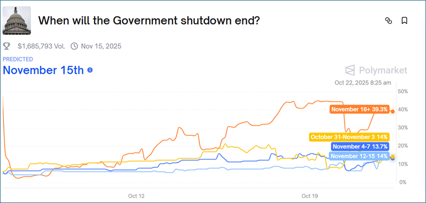 - The shutdown enters its 21st day marking the second longest on record. The record-holding 2018-2019 shutdown appears in danger of falling as Polymarkets is betting it goes well into November and Congressional action on the matter seems lifeless (see graph below). By the way, November 5th would mark a new record. In the meantime, we search for alternative data points where we can find them until the hastily assembled September CPI report due on the newly named Inflation Friday. Meanwhile, Treasury yields continue to slip quietly lower. Currently, the 10yr Treasury is yielding 3.96%, down 1bp on the day, while the 2yr note yields 3.45%, also down 1bp in early trading.