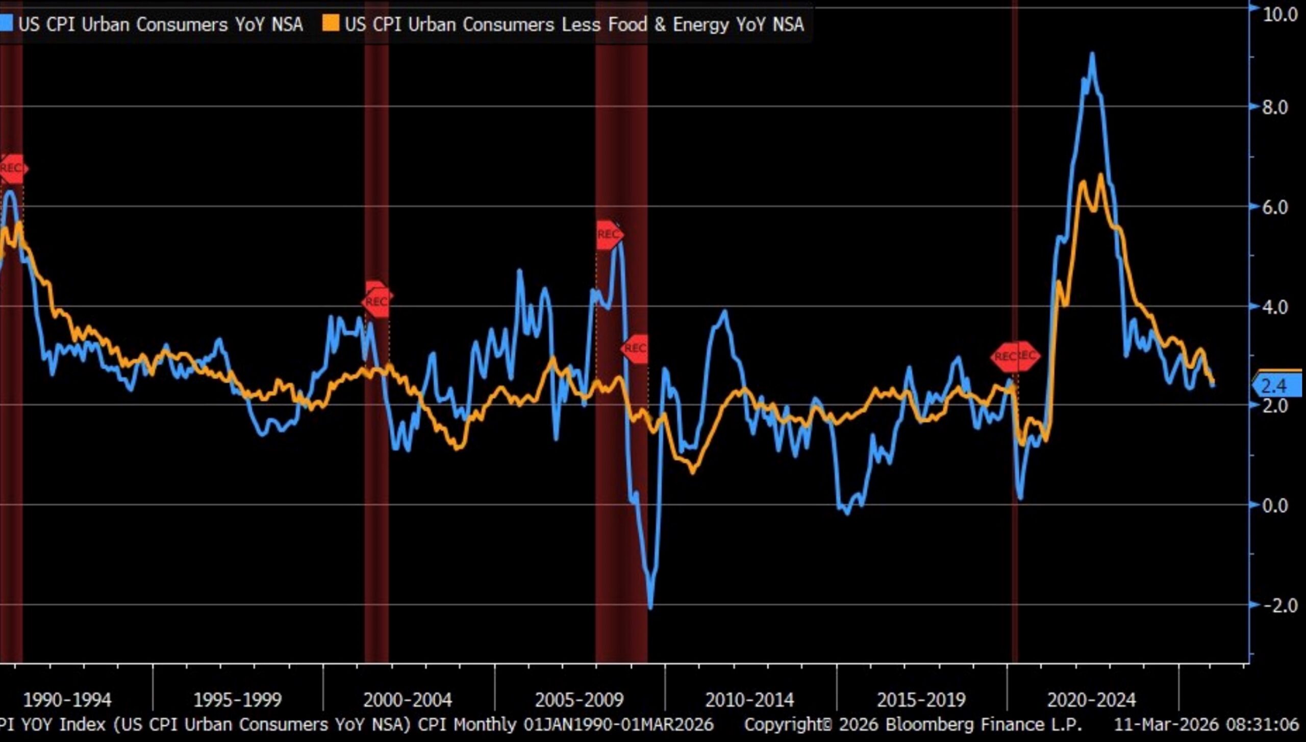 - Today’s February CPI was close to expectations, but this is all before the surge in oil prices that followed the opening salvo in the Iran war. So, exactly how much will be paid to this report? We suspect it will get its fair share of attention, especially the core number, but the bias will be that succeeding months will show signs of higher oil and supply line constraints. As for February, overall inflation increased 0.3% for the month, matching expectations with the YoY rate unchanged at 2.4%.