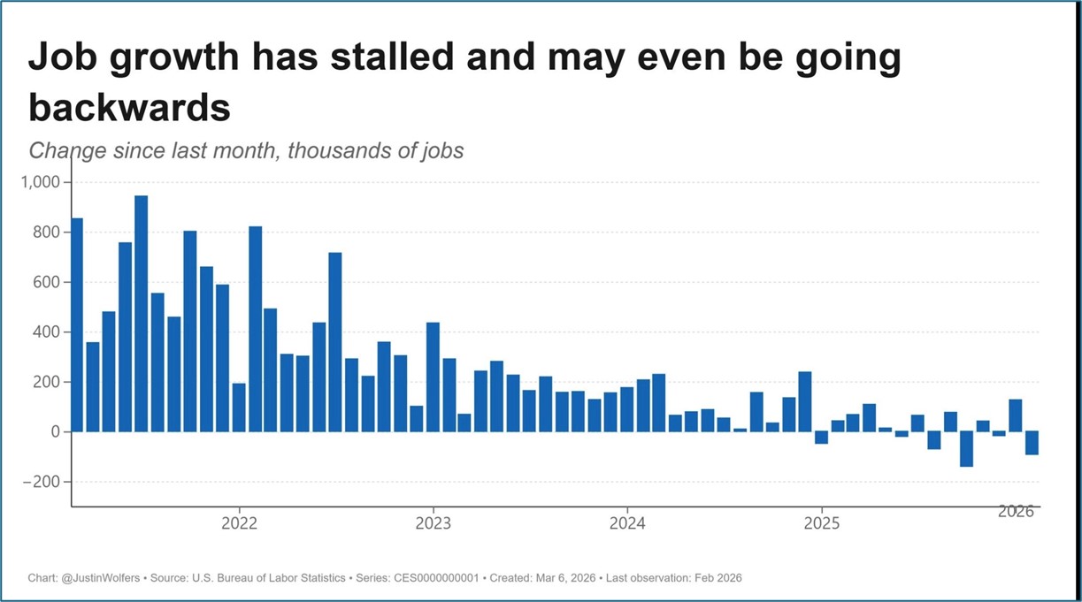 - Bottom line: even with all the moving parts and some strange results, we can say the hiring machine that looked to have rebounded in January reversed in February, so we recommend averaging the two months together to get a pretty flat start to the labor market. The market has pretty much shrugged off this report for two reasons : (1) the adjustments in the Household Survey follow benchmarking adjustments to the Establishment Survey in January which makes the volatility between the two months even more challenging; (2) The focus is more clearly on the oil price spike and the ongoing cost/inflation concerns with the Iran war. So, with the market doing some of the Fed’s work in gently higher rates in the face of increasing inflation risk, the Fed will sit, somewhat concerned over the increased unemployment rate, but remain firmly in pause mode for now.