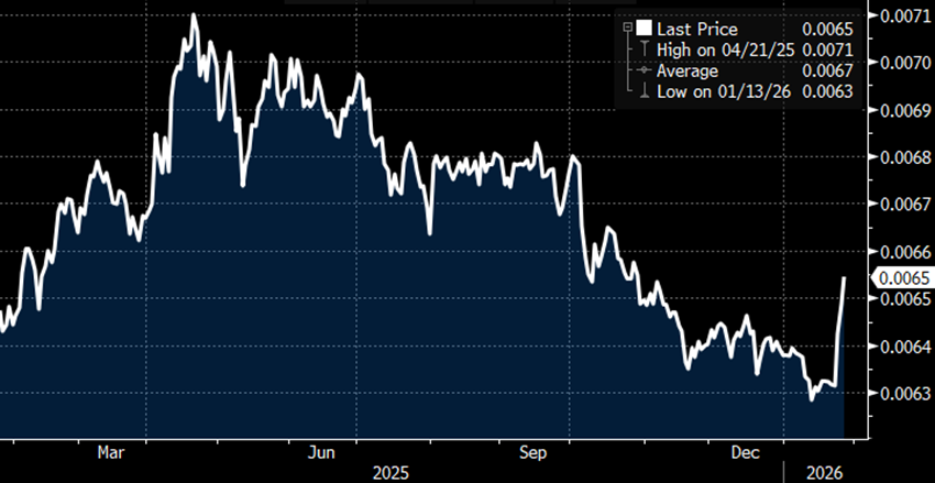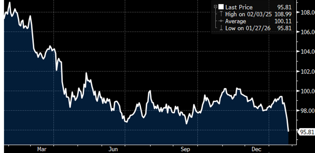 - Meanwhile, the US dollar is going through some things. It’s off more than 12% since its 2025 peak on February 3rd and in the early days of 2026 it’s down 2.2%. Part of the blame for the 2025 weakness was the ever-changing tariff and trade policies. A new wrinkle this year is the claim that the US may be aiding Japan in supporting its currency (selling dollars, buying yen) in a bid to keep Japanese bond yields from climbing further and limiting the potential for lower US yields. In any event, dollar depreciation makes imports more expensive which may play to the Trump administration’s overriding desire to reduce the trade deficit, but more immediately it may create an uptick in inflation until imported goods flow start to slow. It’s one of the things to put on the radar as we move through the year (see graphs below).