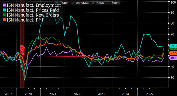- Turning to the mundane matters of economics, as we mentioned above, the first week of the month provides a deluge of reporting on the prior month’s activity, and despite the outbreak of hostilities in the Middle East this week is no different. First on the list is the ISM Manufacturing Survey at 10am ET with the headline reading expected to tick slightly lower from 52.6 to 51.8. The 52.6 from January was a surprising beat and well clear of the 50 dividing line between an expanding versus contracting sector. It was the first time above the 50-level since a one-month pop in January last year. Can it maintain a plus 50 reading this year unlike in 2025? The other readings within the report, Prices Paid, New Orders, and Employment all moved higher in January and will get plenty of scrutiny along with the headline reading as well.