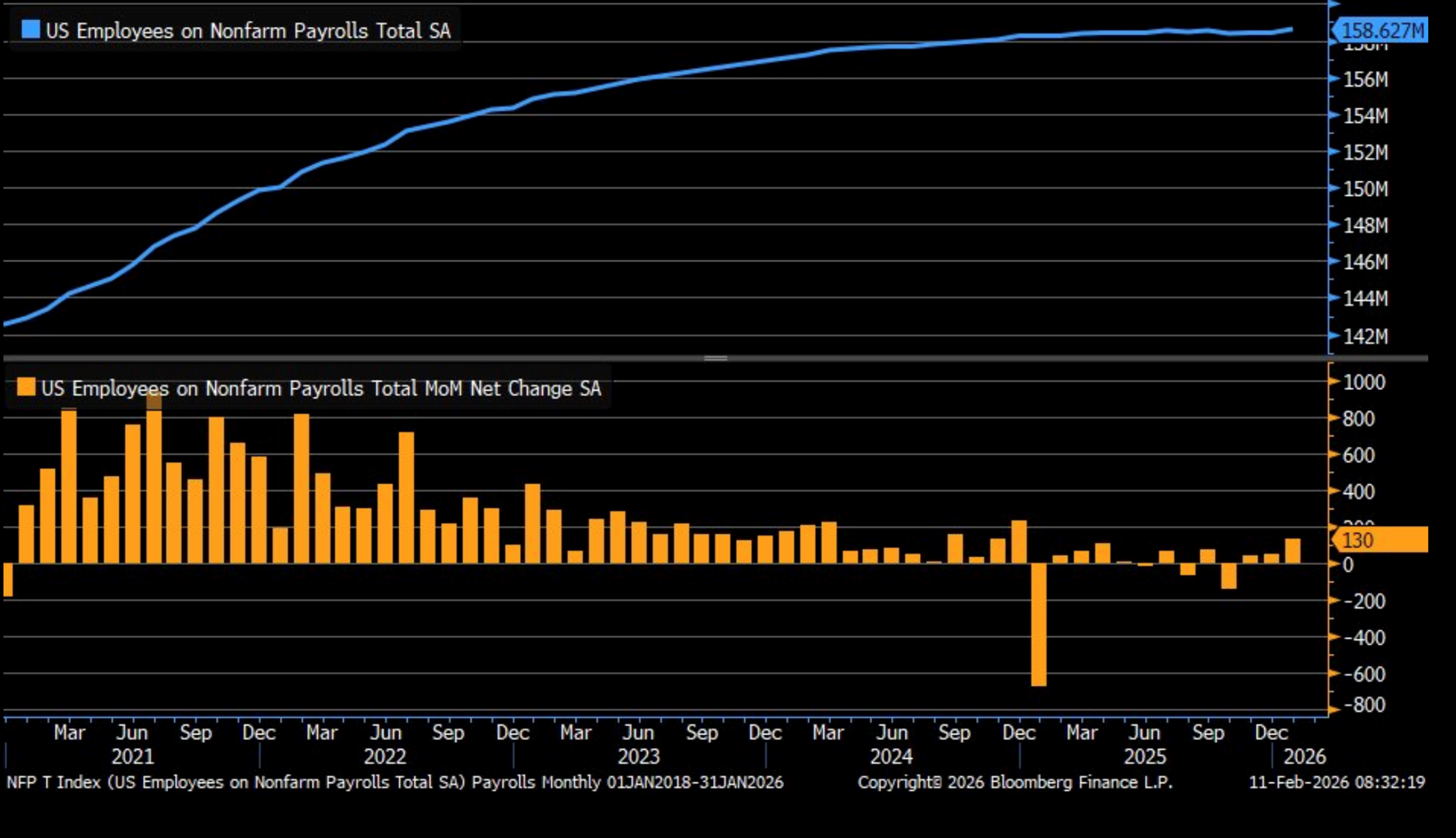- January nonfarm payrolls rose 130 thousand, doubling the 68 thousand expected and 48 thousand gained in December (revised lower from an initial 50 thousand). Two-month revisions cut 17 thousand jobs from previous estimates with November revised 15 thousand lower and December 2 thousand lower. Private sector job growth was 172 thousand which is more than double the 70 thousand expected and 64 thousand increase in December. Fed Chair Powell recently said Federal Reserve staff estimated that BLS is overstating hiring by around 60 thousand per month; thus, the latest job growth number keeps us above water if that estimate is close to accurate.