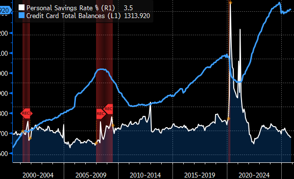 - The personal saving rate—personal saving as a percentage of disposable personal income—was 3.7% in October followed by 3.5% in November. The savings rate is at a three-year low while credit card balances continue to grow as a funding source (see graph below). Those who have been predicting the demise of the US consumer have pointed to the declining savings rate as a harbinger of slower consumption ahead, but the US consumer has found ways to continue funding their spending habits. The question is with wage gains moderating and job growth slowing, how long can debt financing keep the spending gains going?
