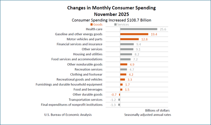 - Personal incomes increased 0.1% in October, followed by an increase of $80.0 billion, or 0.3% in November. Meanwhile, on the spending side, personal consumption expenditures (PCE) increased $98.6 billion or 0.5% in October. This was followed by an increase of $108.7 billion or 0.5% in November. The increase in spending was led by health care, financial services and insurance, and other services. Good side spending was led by gasoline and other energy goods as well as motor vehicles and parts (see spending table below).