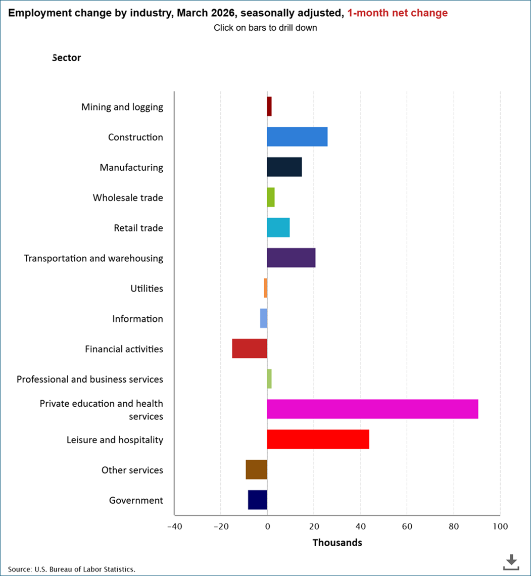 - In summary, today’s release eased some fears from the miss in February and matches some of the other employment-focused reports received this week (ADP, JOLTS, ISM, Jobless Claims) that painted a picture of employment momentum holding somewhat steady and importantly not indicating an imminent leg lower. The healthcare sector returned as the leading job gainer and the buildout of AI data centers rebounded from weather-related slowing in February as construction jobs saw an 26k increase.