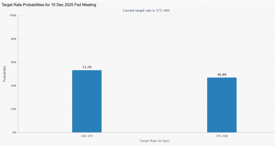 - With several Fed officials recently voicing more concern over inflation and less about the economy/jobs, odds for a rate cut in December have plummeted from a 96% probability a month ago to a toss-up at this point (see graph below). That shift contributed to the tech-heavy selling yesterday in stocks, which coincidentally has been the sector fueling the wealth effect for well-to-do consumers flush with stock portfolios near all-time highs. Oh, and futures are pointing to more selling of tech today. Just this week, we are up to four Fed regional presidents with an FOMC vote not pushing the case in recent speeches for a cut next month. Perhaps the lack of data has contributed to a steady-as-she-goes view of the economy? Here’s hoping the eventual release of the missing data doesn’t reveal a different story. Currently, the 10yr Treasury is yielding 4.07%, down 4bps on the day, while the 2yr note yields 3.55%, down 5bps in early trading.