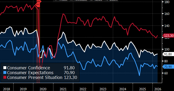 - If you recall, the University of Michigan Sentiment Survey last Friday was a rather discouraging read on consumer confidence, especially in the survey period encompassing the beginning of military operations in Iran. Yesterday, the Conference Board issued its Consumer Confidence Report for March, and it wasn’t great but not quite as discouraging as the Michigan results. In fact, consumer confidence unexpectedly improved to 91.8 in March vs. 91.0 in February and better than the 87.9 expectation. The Present Situation metric improved to 123.3 vs. 118.7 prior and 118.0 expected. The Expectations metric slipped to 70.9 vs. 72.0 in February but above the 68.4 forecast. The Labor Differential (Jobs Plentiful – Jobs Hard to Get) inched up to 5.8 from 5.7. Admittedly that’s minimal improvement and remains near the bottom of the range as labor market momentum continues to struggle (see graph below). Unsurprisingly, year-ahead inflation expectations jumped to 6.2% from 5.5%, the highest since May 2025. Unlike the Univ. of Michigan series, the Conference Board doesn’t provide a longer-run inflation outlook which the Fed likes to see “well anchored.” In summary, it’s a slightly better view of the consumer than Michigan.