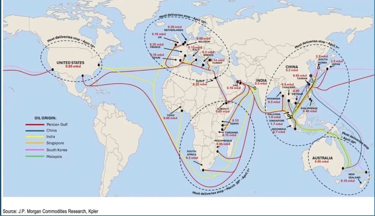 - Not to sound overly alarmist but shipping-related executives and industry experts seem to be more concerned over the shutting of the Strait of Hormuz than financial markets are pricing in. Sure, oil and related prices are higher, and equities have struggled, but in some views, the impact of the shipping blockage hasn’t really begun to be felt yet, but that’s about to change. JP Morgan analysts prepared a global view of when different areas will receive their final pre-war shipments through the strait. East Asia (China, Japan, Korea, etc.) will feel it starting today as the final pre-war shipments arrive with little behind them. The wave then spreads west to Europe in another week and finally North America a couple weeks after that. Keep an eye on markets and pricing in April as this wave slowly spreads across the globe (see graph below).
