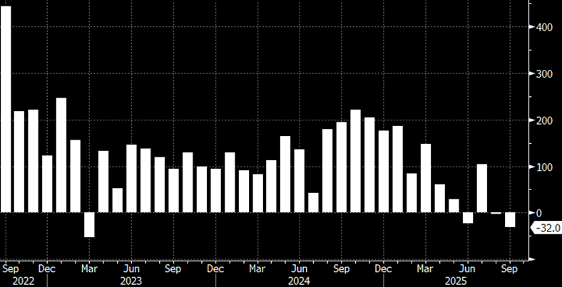 - Also, on Wednesday ADP will post its October private sector jobs total with 25 thousand new jobs expected vs. a loss of 32 thousand in September. Obviously posting a positive number in October will help ease some recession worries, but we’d rather see the complete picture from BLS that we haven’t had since August. The wage growth, or lack thereof, of job stayers and job leavers will be of interest too as we search the meager offerings of job data for a second month.