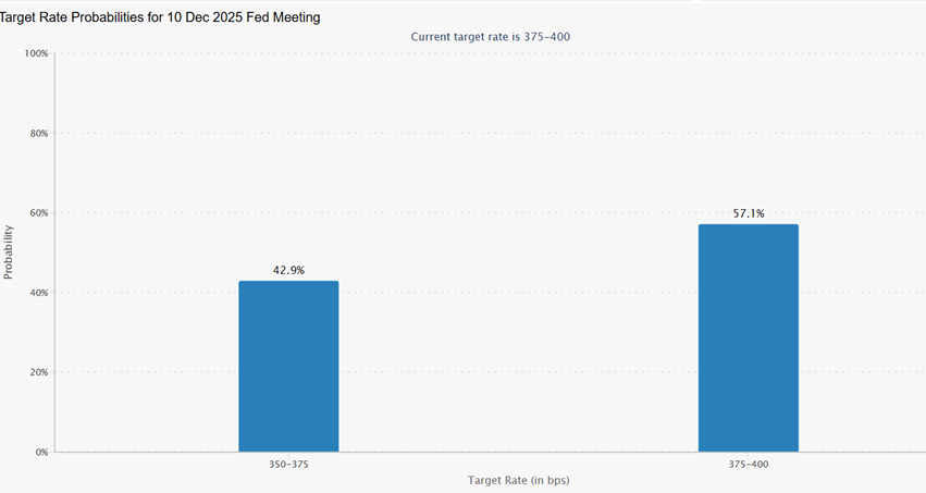 - As far as Fed speakers go this week, we have Fed Governor Jefferson kicking things this morning at 9:30am ET giving us his economic outlook. Jefferson has usually voiced a cautious approach to policy so I can see him siding with the pause camp. This afternoon, Minneapolis Fed President Neel Kashkari will speak at 1pm ET, and Fed Governor Waller will be speaking from London on his economic outlook. Waller has been one of the more vocal members pulling for a December rate cut, so if we hear anything different today that will be news.