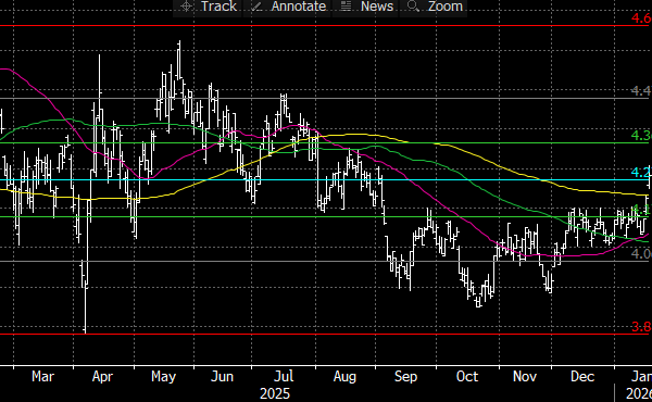 - As an aside, we mentioned last week that the 10yr Treasury had traded between 4.10% and 4.20% for weeks such that the two standard deviation Bollinger Band measure drifted inside 10bps. The previous five times the Bollinger Band measure was less than 10bps it resolved with an upside yield break, averaging 20bps. Well, make that six straight times, with a high just over 4.30%. That still leaves it shy of the 20bps average move. That average, if hit, would put the yield near 4.40%, with 4.50% a clear psychological target if the Greenland impasse continues.