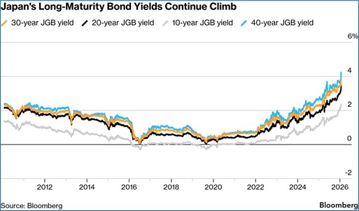 - The backup in yields isn’t all about Greenland. Most of it yes, but a little push was provided by Japan as their new prime minister is promoting the idea of a new tax exemption on food to improve affordability and promote consumption. It’s part of a larger plan to boost spending and cut taxes to stimulate the economy but it brings with it fiscal concerns. That has Japanese yields hitting multi-year highs which is contributing to the global bond selling, but on a second-order level.