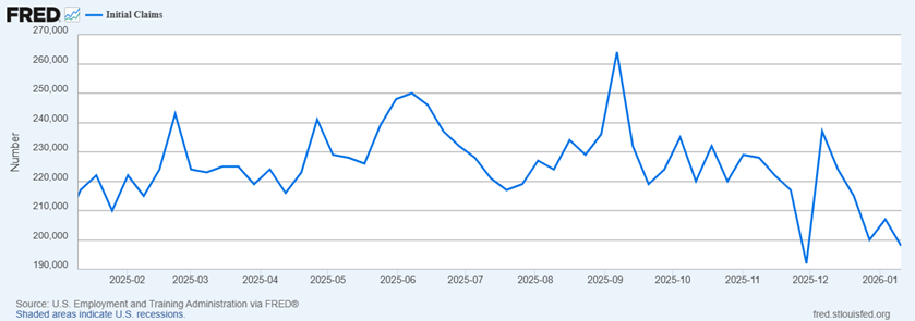 - During the week ending January 3 continuing jobless claims totaled 1,884,000, a decrease of 19,000 from the previous week’s revised level. The previous week’s level was revised down by 11,000 from 1,914,000 to 1,903,000. The 4-week moving average was 1,889,250, a decrease of 250 from the previous week’s revised average. Thus, the latest real-time read on jobless claims continues the 2025 trend with no pick-up in layoffs noted, while continuing claims remains somewhat elevated. That illustrates the challenging nature of finding new employment, and while not moving dramatically higher, the elevated state of continuing claims indicates something of a weakening equilibrium in the labor market.