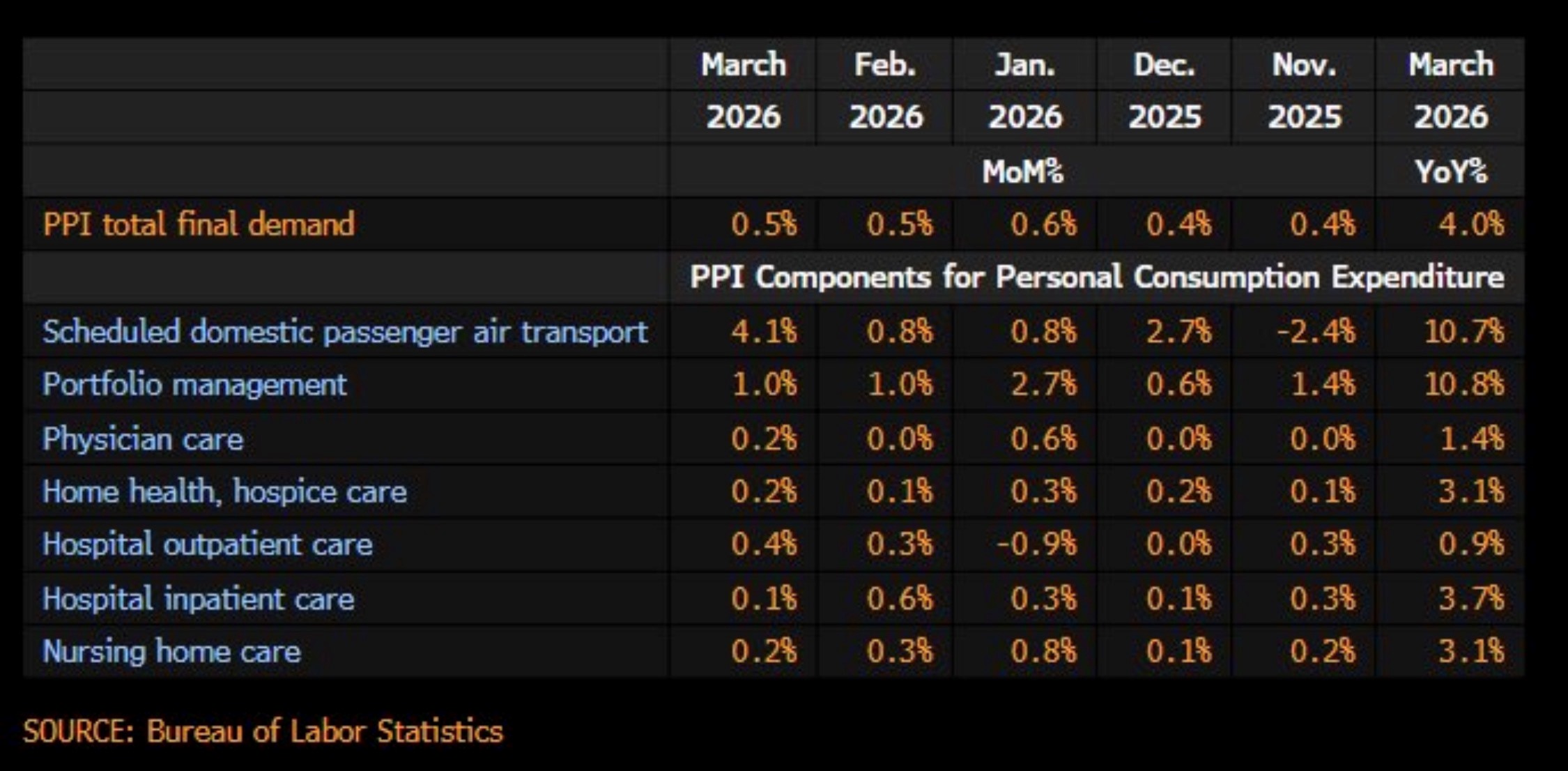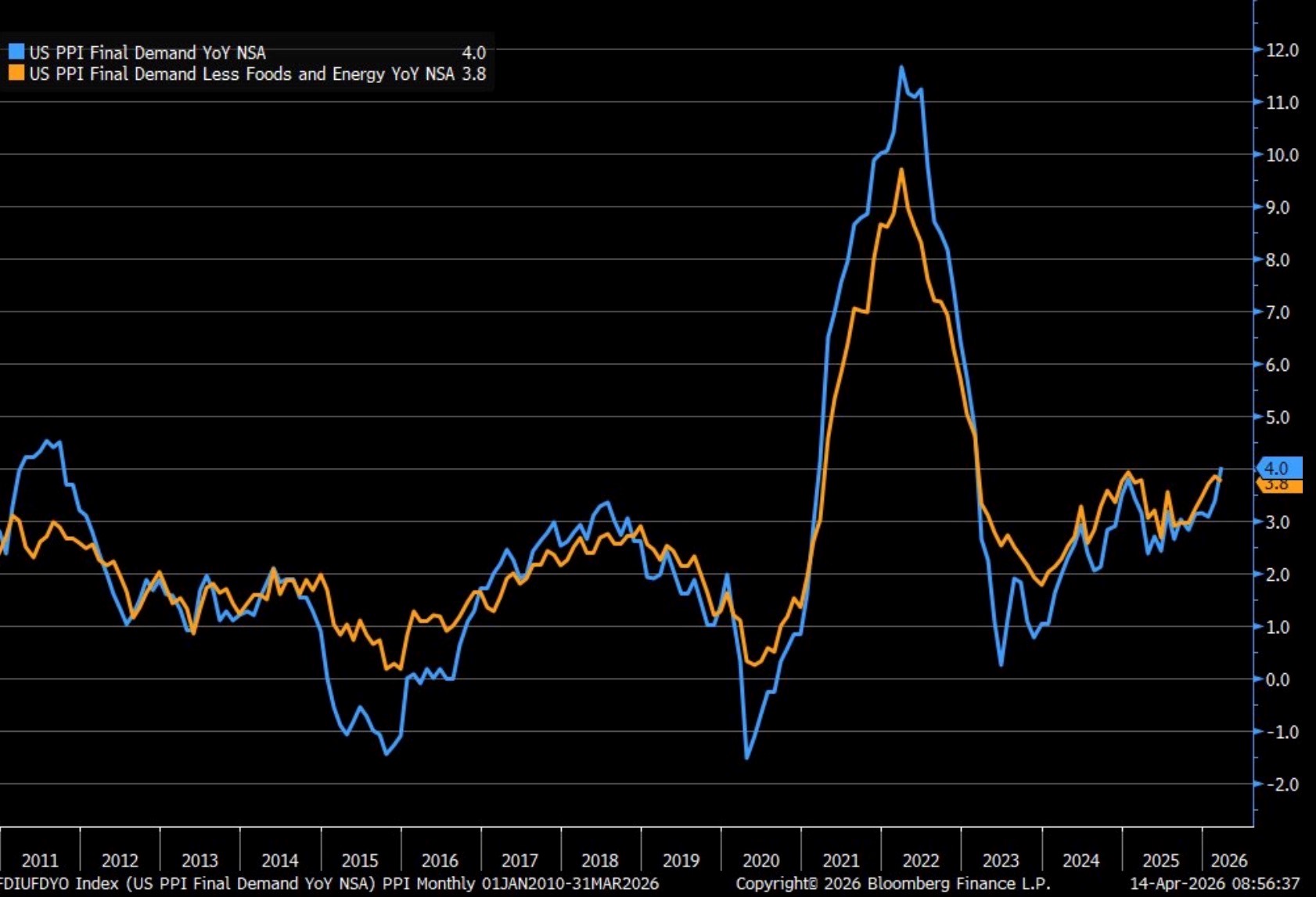 - Today marks the deadline to file your 2025 tax return, and for all those owing Uncle Sam some more money I imagine at some point today the return will be reluctantly placed in the mailbox, or the send button on the computer grudgingly pressed. Apart from our collective fiscal obligations, the war story continues and the final bits of March inflation data dribble in (more on that below). For now, markets are behaving with WTI oil back under $100 ($91 to be exact) despite the double blockade of the Strait of Hormuz. It’s a tentative start to the day, however, with equity futures vacillating around unchanged and Treasury yields in familiar territory. Currently, the 10yr is yielding 4.27%, up 1bps on the day, while the 2yr is yielding 3.76% also up 1bps on the day.